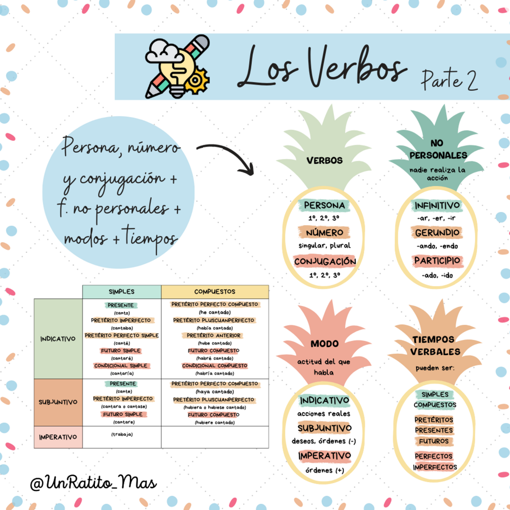 4 piñas con el análisis de verbos (A4 e individual) + tabla de tiempos verbales (A4 + A5)