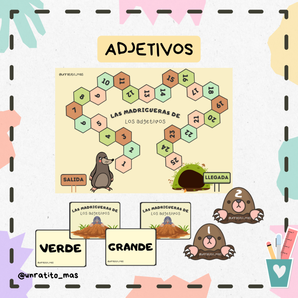 Un tablero, fichas (topos) y tarjetas con sustantivos y adjetivos. El juego lleva instrucciones.